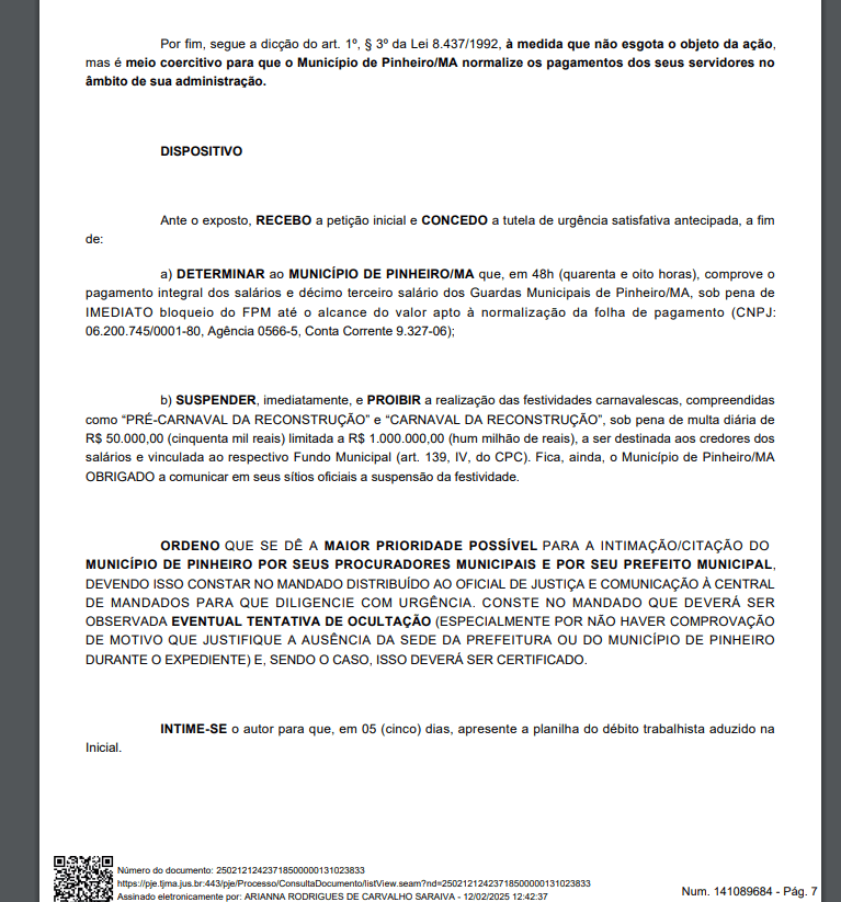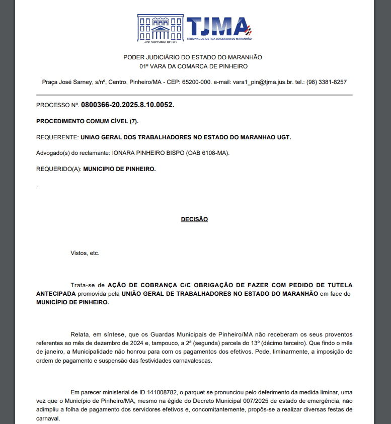 A Justiça do Maranhão determinou a suspensão do Carnaval em Pinheiro, devido ao atraso no pagamento dos salários e do 13º dos Guardas Municipais. A decisão foi proferida pela juíza Ariana Rodrigues, que exige que a Prefeitura de Pinheiro regularize a situação em até 48 horas, sob pena de bloqueio do Fundo de Participação dos Municípios (FPM).